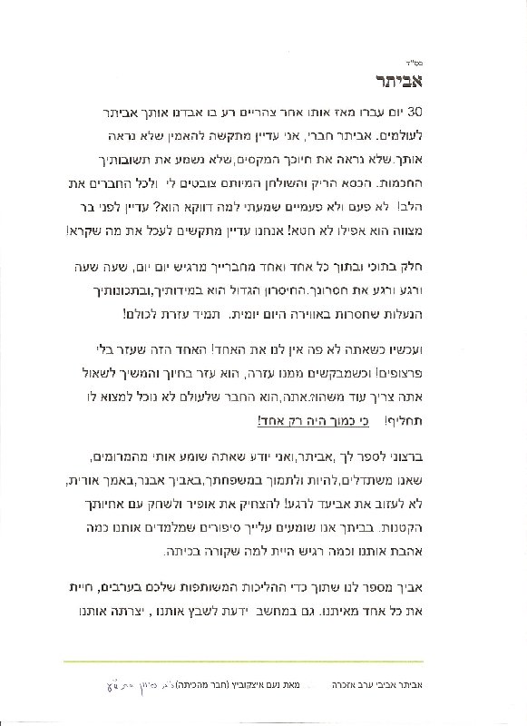 הלוואי שכולנו נקבל על עצמינו את המידות שאביתר קיבל על עצמו, וכך לא נשכח אותו, והוא יישאר בתוכנו.